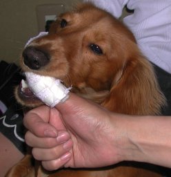 | 僕、ほんとに何もおぼえてないんだよぉー 足が痛くて、夢中でちょっとかんだだけ・・・・ あっそうか、ぼく、やっぱりかんだんか。 |