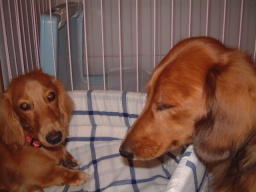 | 「さあ、ここがドッグランよ。」 「ハッピーちゃん、みんなと遊んでらっしゃい。」 あの、ちょっと、こしがぬけて・・・・ こ、こ、こわい・・・・ |