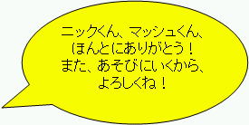 | マッシュくん「ハッピーちゃん、楽しかったねー!」 「また、遊びに来てねー!」 |