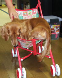 ベビーカーに乗せてもらってこわがっても、 オカマ犬ということで、許されるんだよ。 |