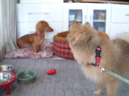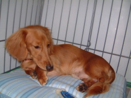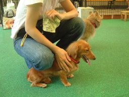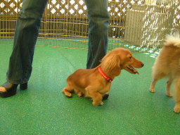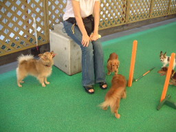 | 「さあ、ここがドッグランよ。」 「ハッピーちゃん、みんなと遊んでらっしゃい。」 あの、ちょっと、こしがぬけて・・・・ こ、こ、こわい・・・・ |