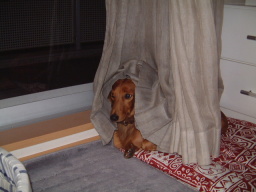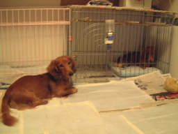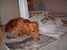 | 「しつけ」ってなんじゃ? えーと、おしっこって、どこでするんだっけ? ま、このあたりにしとっか、 |